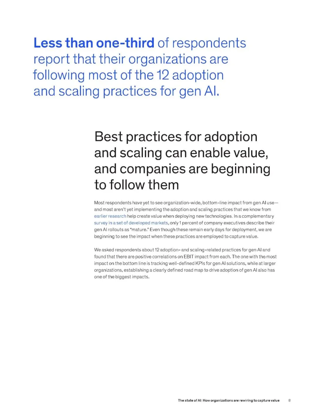 调研分析了 25 项企业组织相关的属性,最终得出一个最核心的结论:对生成式 AI 的 EBIT 贡献影响最大的,不是技术模型有多先进,不是算力投入有多大,而是企业有没有随着 AI 的部署,从根本上重新设计工作流。这个结论打碎了很多企业的 AI 转型幻觉。
