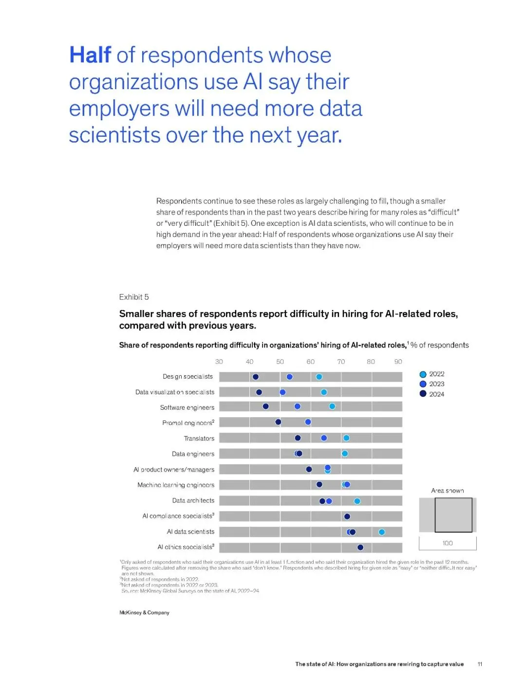 AI 正在深刻改变企业的人才需求结构。调研显示,使用 AI 的企业中,过去 12 个月里招聘 AI 相关岗位的比例,和 2024 年初基本持平,唯一出现明显下降的,是数据可视化与设计专家岗位的招聘需求。一批和风险相关的全新 AI 岗位,正在进入企业的招聘清单,13% 的受访者表示企业招聘了 AI 合规专家,6% 的企业招聘了 AI 伦理专家。