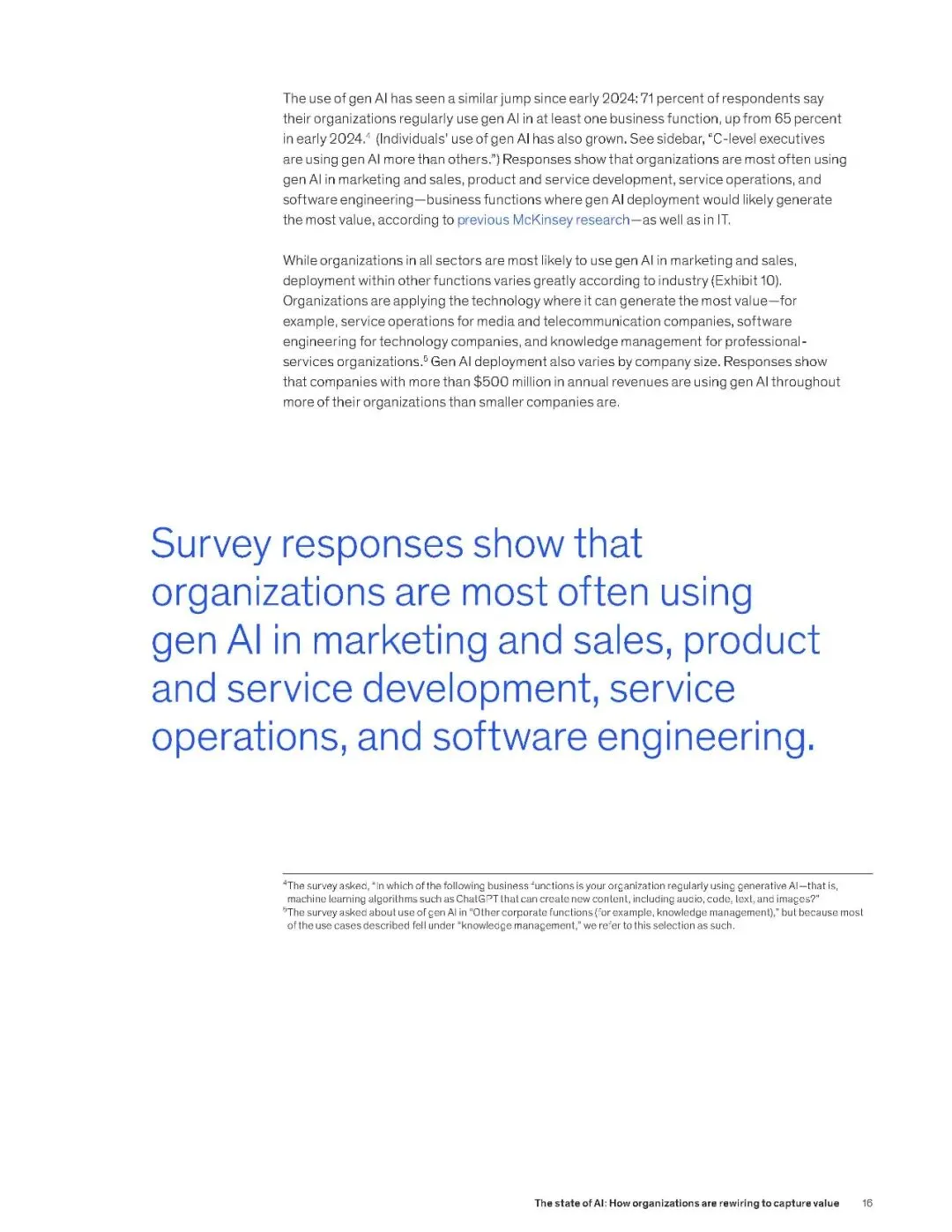 调研显示,超过四分之三的受访者表示,所在企业已经在至少一个业务职能中使用 AI,这个数字在 2024 年初还是 72%,一年前更是只有 55%。生成式 AI 的普及速度更快,71% 的受访者称企业会在至少一个业务职能中常规使用生成式 AI,较 2024 年初的 65% 再次攀升。
