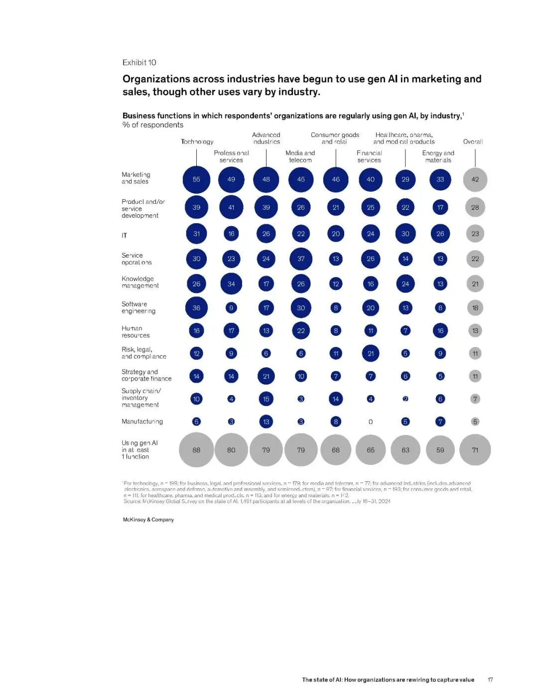 生成式 AI 的应用模态正在变得越来越丰富。63% 的生成式 AI 应用企业,会用 AI 生成文本内容,这是目前最主流的应用方式。超过三分之一的企业会用 AI 生成图像,超过四分之一的企业用 AI 编写计算机代码,还有 13% 的企业会用 AI 生成视频、语音和音乐内容。不同行业的应用重点有着明显的区别,全行业都把营销与销售作为生成式 AI 最核心的应用场景,科技行业的企业在软件工程环节的 AI 应用比例最高,专业服务行业的企业更倾向于在知识管理环节使用 AI,媒体与电信行业的企业则在服务运营环节大量部署生成式 AI。