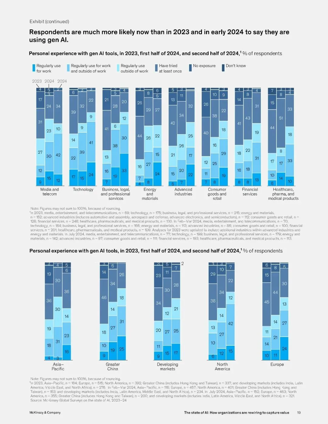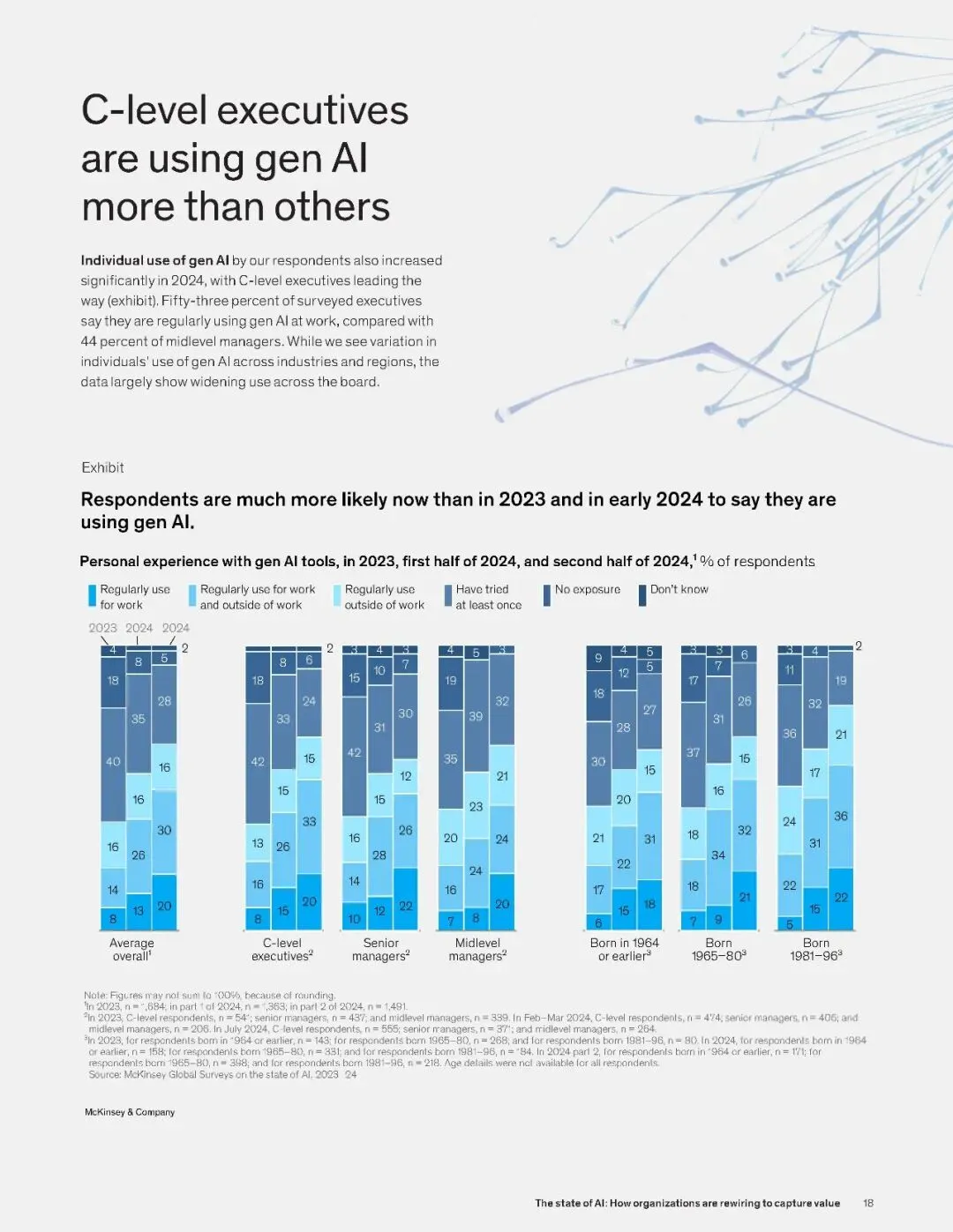生成式 AI 的个人使用频率在 2024 年出现了大幅上涨,而走在最前面的,是企业的 C 级高管。53% 的受访高管表示,会在工作中常规使用生成式 AI,这个比例高于中层经理的 44%。这个数据打破了很多人固有的印象,不是年轻员工更愿意接受和使用 AI,反而是企业的最高管理层,在工作中的 AI 使用频率更高。