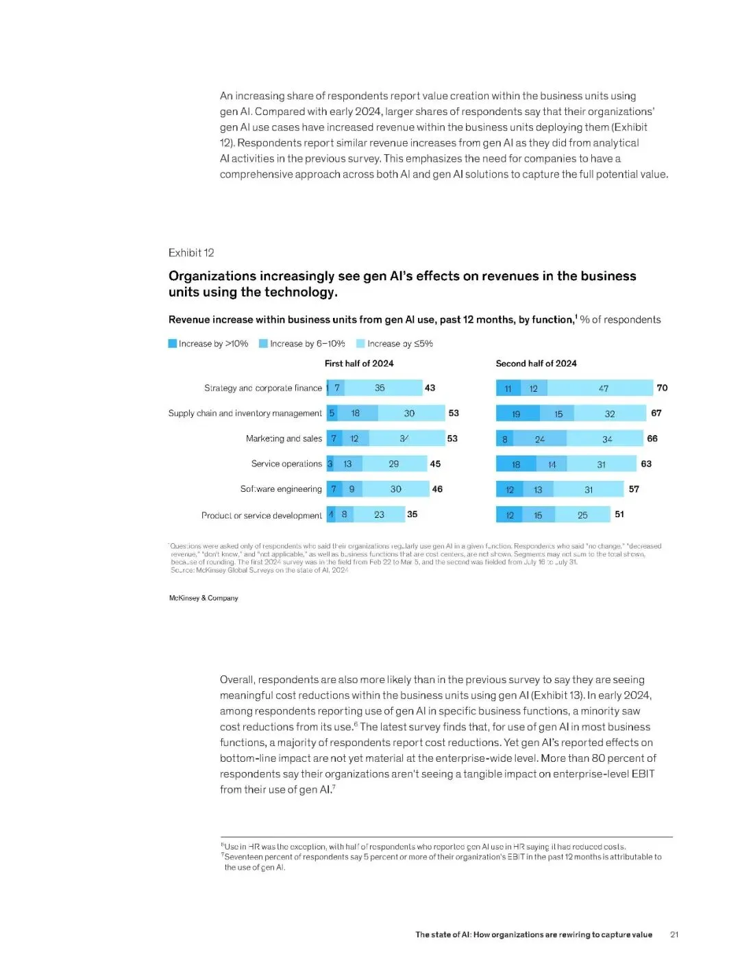 虽然企业级的价值兑现还没大规模到来,但在单个业务单元层面,生成式 AI 的价值已经开始显现。和 2024 年初相比,更多受访者表示,所在业务单元通过生成式 AI 的应用实现了收入增长,营销与销售、供应链管理、产品开发这些职能,都有大量企业报告了收入提升。