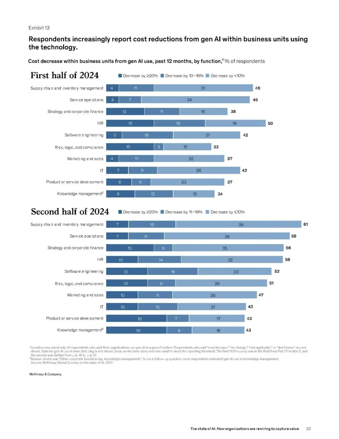 成本下降的趋势更加明显,2024 年初,除了人力资源职能,多数业务职能里只有少数企业看到了生成式 AI 带来的成本下降,而到了 2024 年下半年,大多数业务职能里,都有超过半数的企业报告了成本下降。这些发生在业务单元的真实收益,也正在推动企业跳出零散的工具应用,转向更系统、更彻底的企业级 AI 转型。
