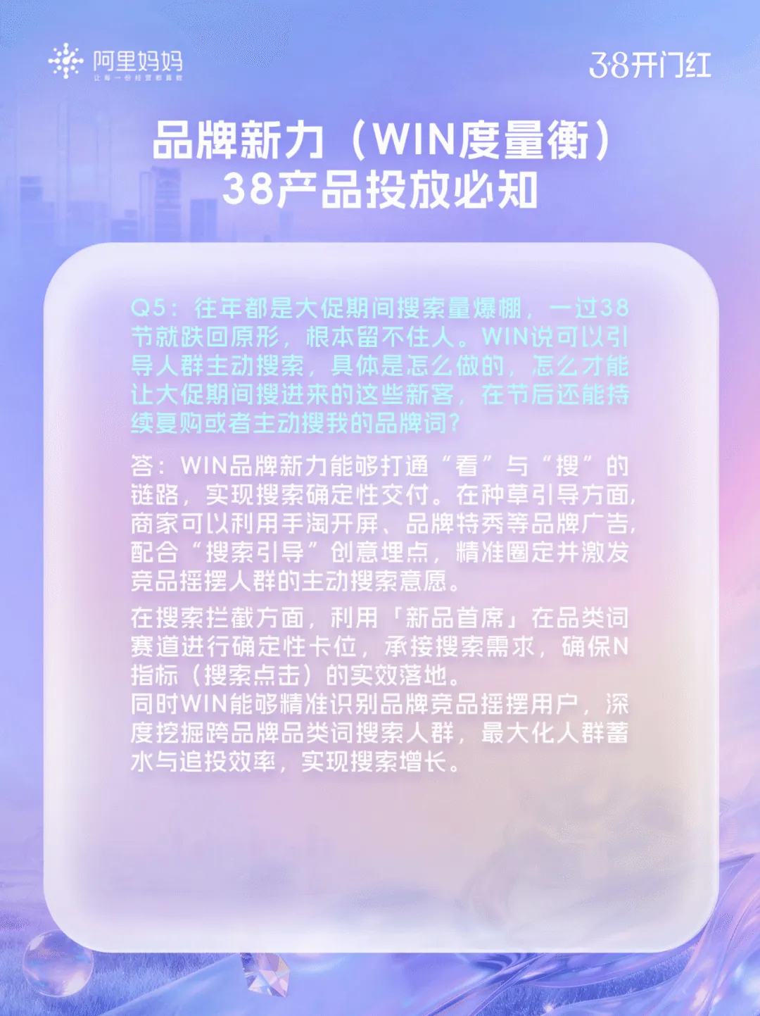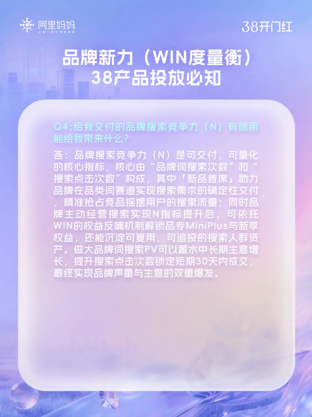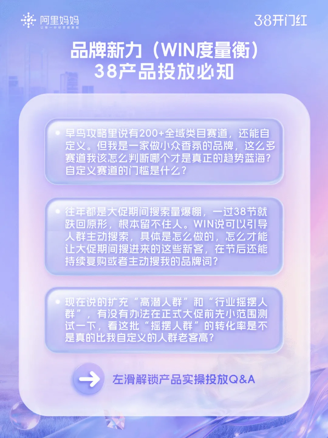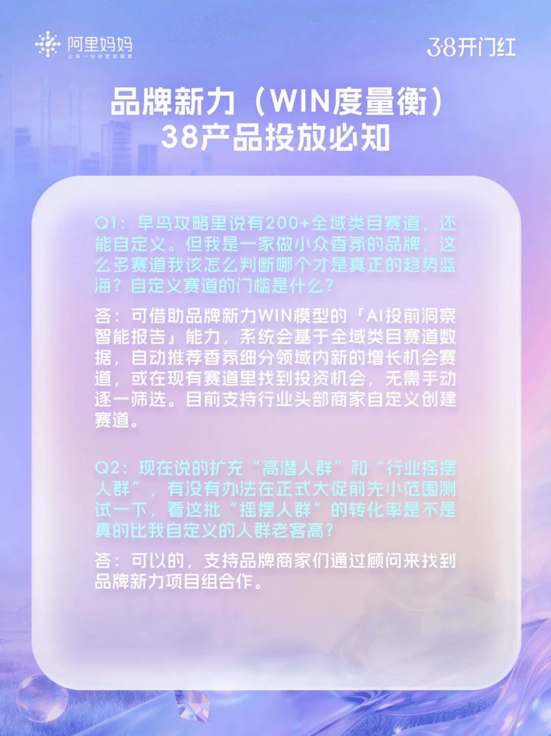 这份阿里妈妈38开门红&焕新周产品实操100问文档,围绕品牌新力WIN度量衡、Uni Desk、淘宝种草、淘内品牌推广等多类投放产品,解答了商家38大促投放的各类实操问题,为不同品类、不同需求的商家提供了全链路的投放策略与操作指引。