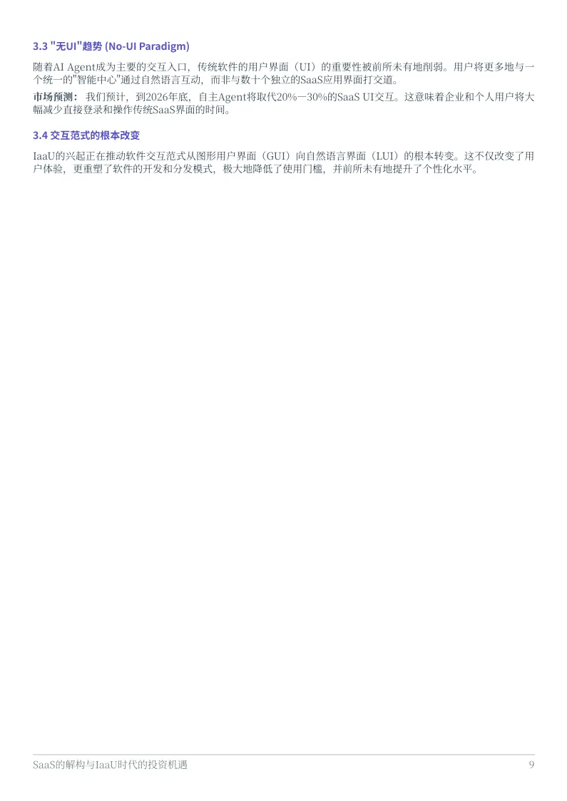 2026年成为软件行业从传统SaaS向“智能即效用(IaaU)”转型的关键节点,标志着“AI原生”元年的到来,行业迎来根本性的范式转移,软件价值从应用UI层和捆绑功能向AI能力层、业务产出端迁移,同时催生出“应用程序的融化”趋势。个人AI助手与自主Agent通过自然语言搭建个性化工作流,让传统单一功能应用退为后台API,AI也从辅助性的“副驾驶”升级为可自主完成端到端流程的“数字员工”,推动软件交互从图形界面转向自然语言界面,“无UI”成为重要发展趋势,预计2026年底自主Agent将取代20%-30%的SaaS UI交互。