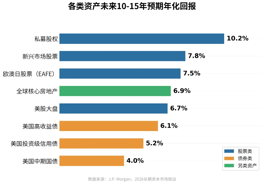JP Morgan给每一种资产类别都算了预期回报。把主要的几个列出来: