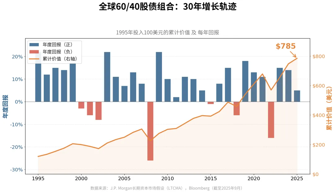 1995年往全球60/40组合里投100美元,到2025年值785美元。30年里经历了互联网泡沫、金融危机、欧债危机、新冠疫情,全都扛过来了。这30年全球股票的年化是8.3%,债券是4.3%。