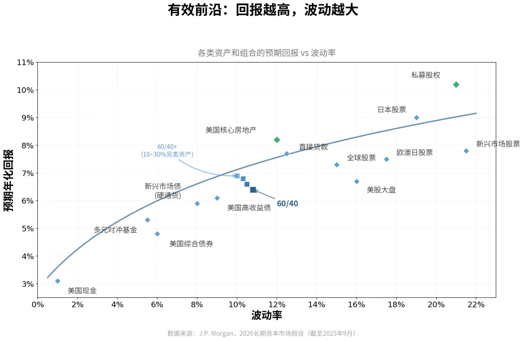 60/40组合的预期回报是6.4%,波动率大约10.8%。想把回报提到7%左右,需要配纯股票,波动率直接升到14%以上。再往上——比如私募股权的10%,波动率是20%+。