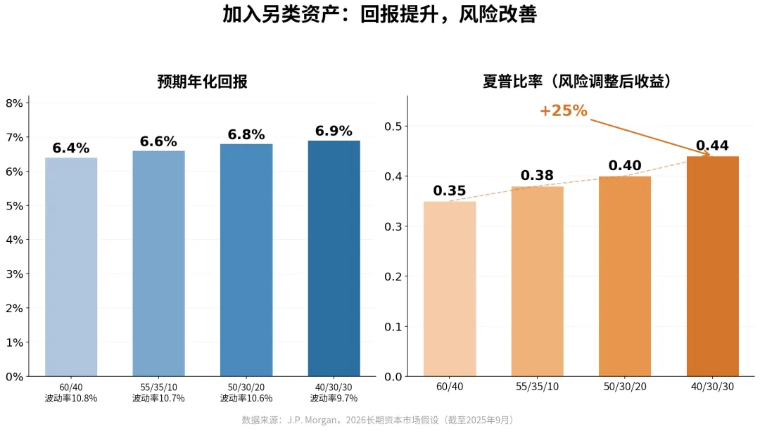 30%的另类配置,额外多了0.5个百分点的回报,但更重要的是波动率降低了、风险调整后的收益明显改善。「这0.5%不是靠冒更大的险换来的,而是靠更分散的配置换来的。」