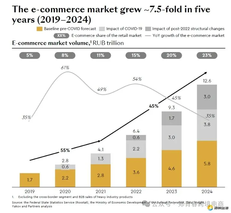 这份亮眼成绩的背后,是俄罗斯电商市场渗透率持续提升、消费需求稳步释放的时代红利,更是Ozon多年深耕市场、精准布局的成果体现。近年来,俄罗斯线上消费习惯加速养成,电商渗透率从2024年的20%提升至2025年的24%,预计未来两年将突破30%,远低于中、美、韩等成熟市场,增长空间十分广阔。