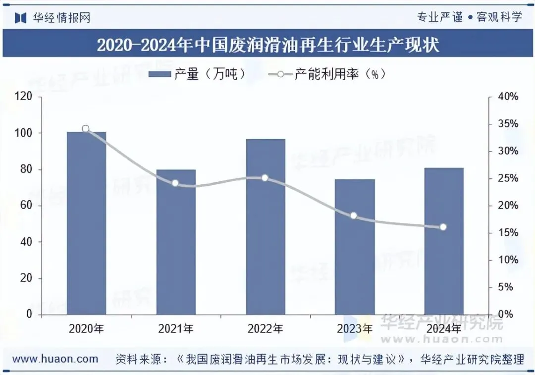 早期的废油再生技术主要依赖简单的蒸馏和过滤工艺,再生油品质量较低,难以满足市场需求。直到20世纪末,随着环保意识的增强和技术创新的推动,我国才逐渐引入了更为环保的生产工艺,废润滑油再生行业开始逐步进入规范化发展阶段。据统计,2024年我国规范运行的再生基础油生产企业实际产量合计81万吨,产能利用率为16%,产能利用率低的原因有多方面,包括市场竞争加剧导致的价格战、原材料价格波动带来的成本压力,以及部分企业技术落后、设备老化等问题。