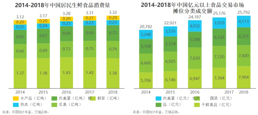 中国统计年鉴数据显示,全国居民消费的生鲜食品总量由2014年的3.1亿吨增长至2018年的3.3亿吨,年复合增长率为1.6%。其中,鲜菜占消费量比重最大,2018年达41.6%。按亿元以上食品交易市场摊位分类成交额口径统计,我国主要生鲜食品品类成交规模由2014年的2.1万亿增长至2018年的2.6万亿,年复合增长率为5.5%。其中,干鲜果品交易额的增速最快,与居民生鲜食品消费情况相符,表现出居民的食品消费由生活必须的食物向更高品质、多样化的消费结构升级的趋势。2014-2018年中国居民生鲜食品消费量及亿元以上食品交易市场摊位分类成交额