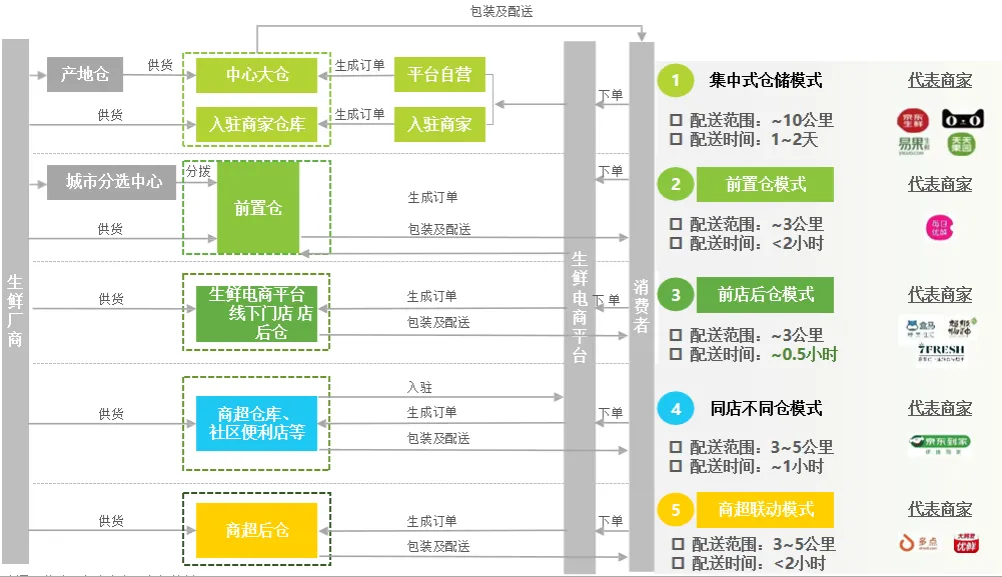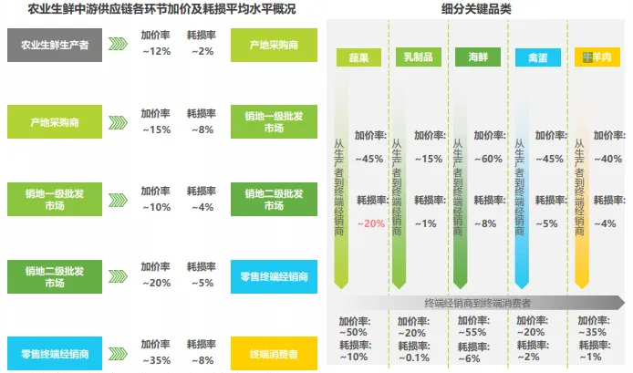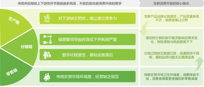 我国主要生鲜品类在储存条件、收货周期、产地分布、生产特征和加工情况上各不相同,这就生鲜的供应链提出了更高的要求。我国幅员辽阔,水果品种繁多,总产量居全球前列。水果产地多分布于北部山东、河北一带,及南部广东、广西等热带地区;我国海鲜水产种类主要分为海水产品与淡水产品,主要分布于华东沿海地区;我国肉类和禽蛋类产地呈明显地域性,华东一带为高产区域;国奶类品产地分布不均,对生鲜物流供应链网有较强依赖。我国果蔬品类的生产过程呈现明显季节性以及地域性分布。我国水果生产基地上半年以南方果为主(热带水果),主产地分布于广东本地、福建省、海南、广西、湖南等地;下半年以北方果为主,主产地位于山东、陕西、山西、河北一带。 传统分销供应链模式下,生产者与消费者相隔多层分销环节。各级批发市场的规模悬殊较大,使得各环节的流通速率、储存条件大相径庭,而繁琐的链条也削弱了从业者的盈利能力。在生鲜分销供应链中,会出现生鲜品的加价和耗损,其中蔬果类总体耗损率最高,从而提高了生鲜的价格。(注:加价率为货品供应流程中下一环节的溢价除以本轮供应流程中货品的进价。)我国目前生鲜零售渠道仍以农贸市场为主。随着“农改超” 政策推进及生鲜电商的渠道渗透率提升,未来农贸市场的占比将持续下降,新渠道加速崛起。中国生鲜电商增速迅猛,2019年生鲜电商市场交易规模达到2796亿元,年增长率达36.7%。未来随着生鲜电商模式的成熟、网购生鲜用户覆盖数量愈发广泛以及技术成熟、生鲜电商供应链的升级,生鲜电商渗透率将快速提升。随着消费者对高品质生鲜产品的需求日益增长,传统供应链的许多弊病愈加暴露出来,传统供应链不能有效匹配生鲜消费升级的发展需要,生产者与消费终端相隔多层分销环节,生产者的终端竞争力受到大幅限制。生鲜电商从下游零售端切入,其中前店后仓冷链物流仓储模式配送效率最高,仓储成本较低,线上线下流量较其他模式更容易互通,但其配送范围受一定局限。连锁超市与便利店一方面在逐步替代农贸市场成为生鲜零售渠道的主导,一方面也在生鲜电商的影响下开始了对新零售业态的探索。然而,各类下游生鲜零售渠道缺乏全方面的冷链物流能力和供应链生态,不具备成熟的顾客端服务能力,故大多商超以原有的线下门店+到家配送服务的形式构建新零售方案,导致成本偏高。传统生鲜供应链企业大多是2B模式,不具备2C端的服务能力。针对这一痛点,新型的云仓模式应运而生,新型供应链服务商通过整合全国范围内的产业链资源,形成生鲜供应链平台,从而实现了从产地至终端消费者的一站式生鲜供应链解决方案。通过对供应链两端的资源与数据充分整合利用,从而提高了全链条的供应效率。(注:2B指to Business服务于餐饮、超市、加工厂等;2C指To Customer服务于顾客)冷链物流是指为保持食品新鲜的品质或其他产品(医药等)的效能以及减少运输损耗,在其加工、贮藏、运输、分销、零售等环节,货物始终保持一定温度的一种物流运输方式。冷链物流主要服务于生鲜供应链的中下游环节。但目前我国的冷链发展同发达国家对比仍存在较大提升空间。一是我国冷库人均保有量与海外国家仍存在一定差距,二是我国生鲜冷链流通率仍处于较低水平。2019年中国冷链物流行业发展规模达3264亿元。资源整合和政策支持推动优质冷链供给的增长。在新基建相关的宏观政策影响下,未来以5G、AI和工业物联网、互联网为代表的行业将会得到快速发展。随着大数据不断开拓升级赋能冷链物流,冷链物流领域的潜力也将会得到进一步的有效释放,持续朝着自动化、智能化云仓模式的方向发展。总结来看,横跨全链条的供应链升级是生鲜新零售时代企业的制胜关键。首先企业需要从源头开始把控产品质量,建立严格的标准化采购要求。通过投资收购或自建品牌的方式推出自有品牌,锁定优质产品供应的同时扩大利润。同时,大范围整合物流资源,进行物流网络的搭建。另外,企业需要进行供应链全链条信息技术驱动,通过持续优化购买时效、增强流通路径透明度,大幅改善消费者体验。只有重视搭建和打磨优秀的供应链能力,生鲜新零售企业才能抓住时代发展的新机遇。