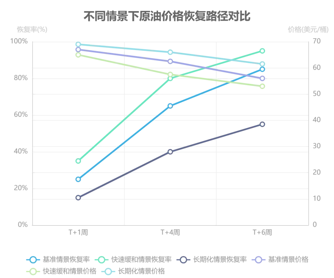 本章节采用“基准情景-压力情景”对比法,构建原油价格在冲突缓和后的恢复时间路径模型。基于历史案例分析,基准情景设定为 T+6 周实现 80-90% 恢复率,对应价格从冲突高峰期的 71 美元逐步回落。具体分阶段路径显示:T+1 周恢复率达 20-30%,价格回落至 66-68 美元;T+4 周恢复率提升至 60-70%,价格进一步回落至 60-65 美元。