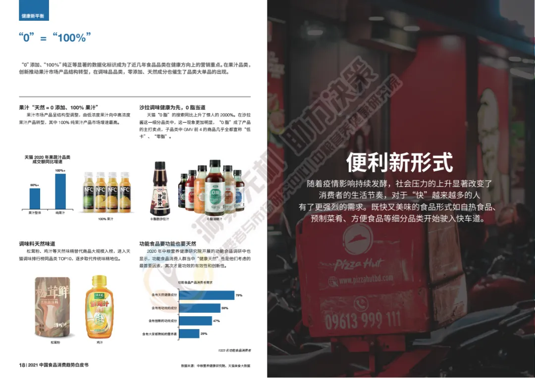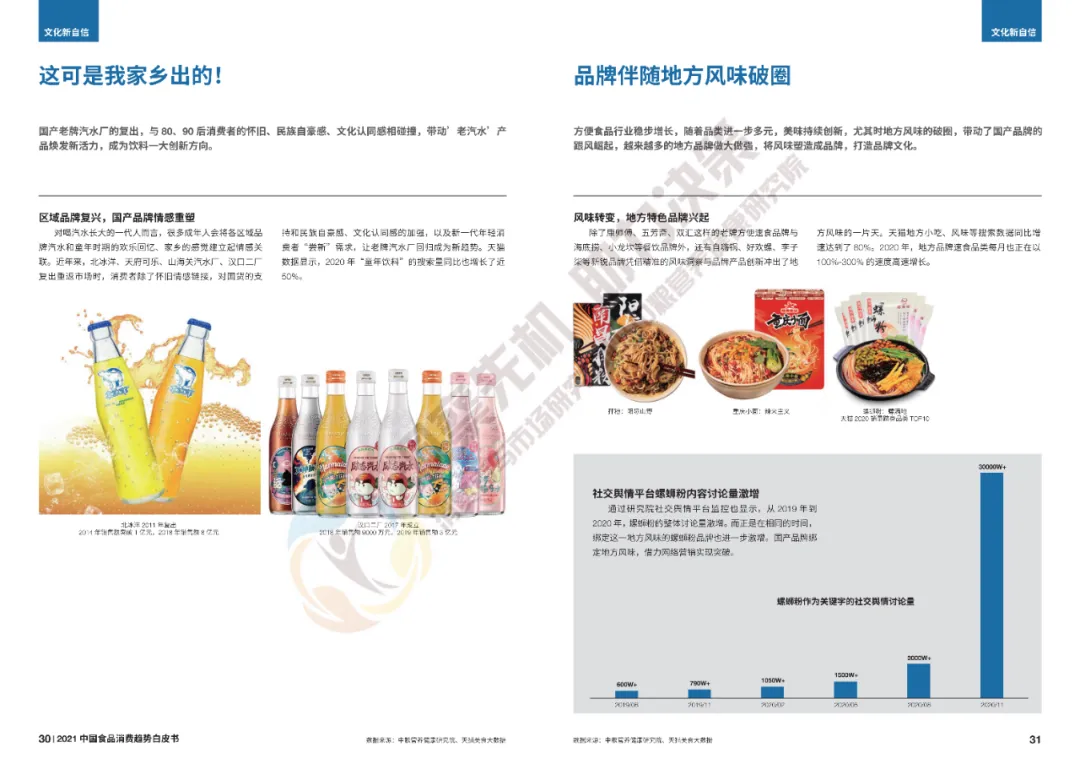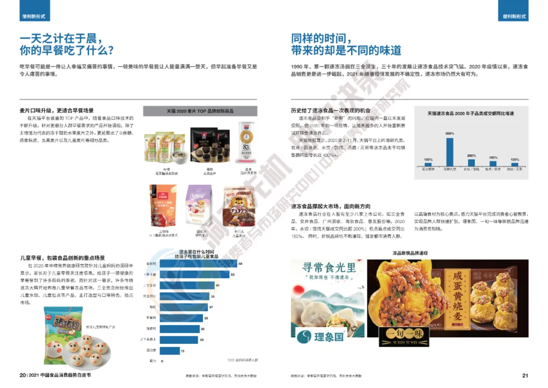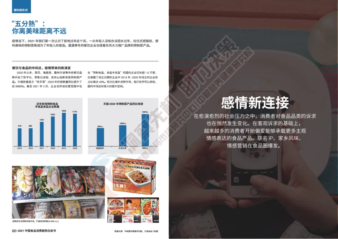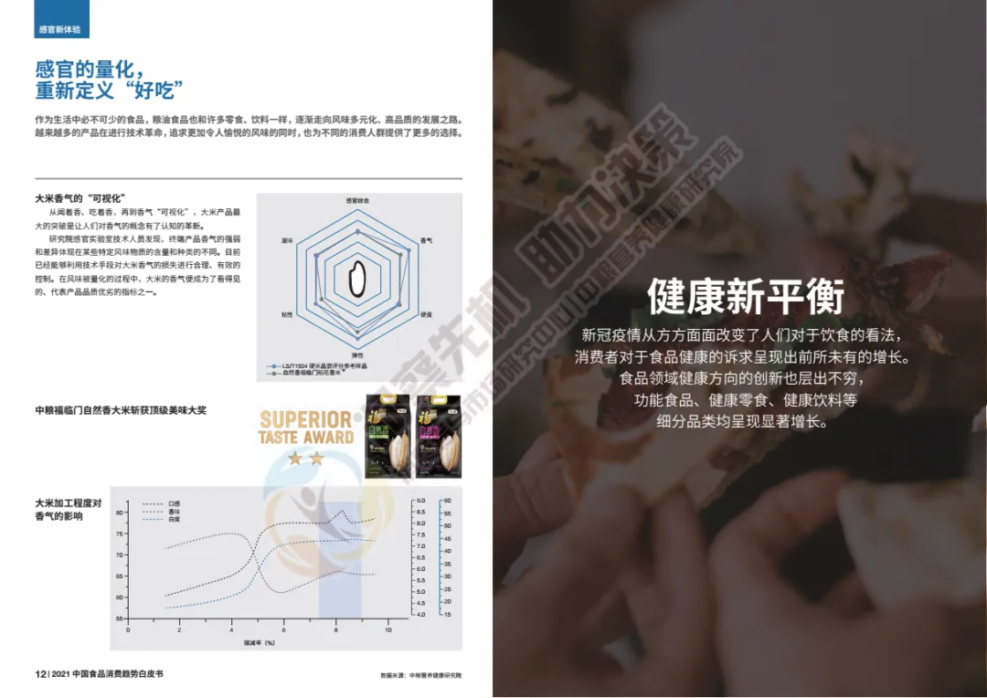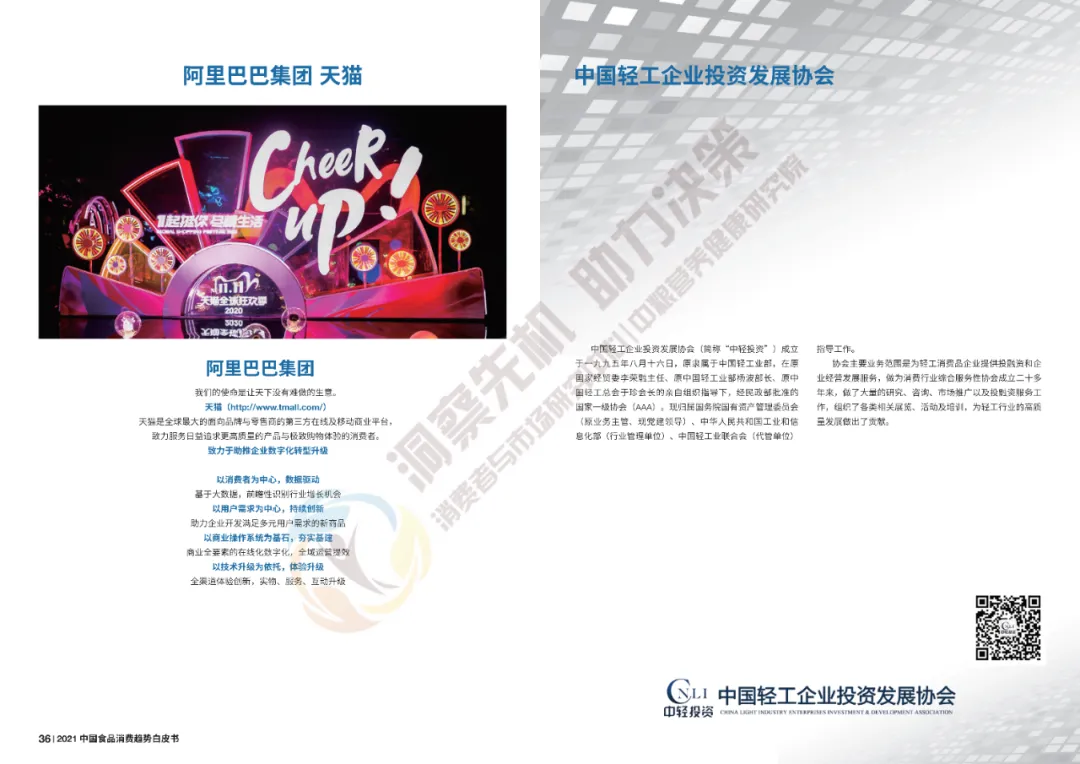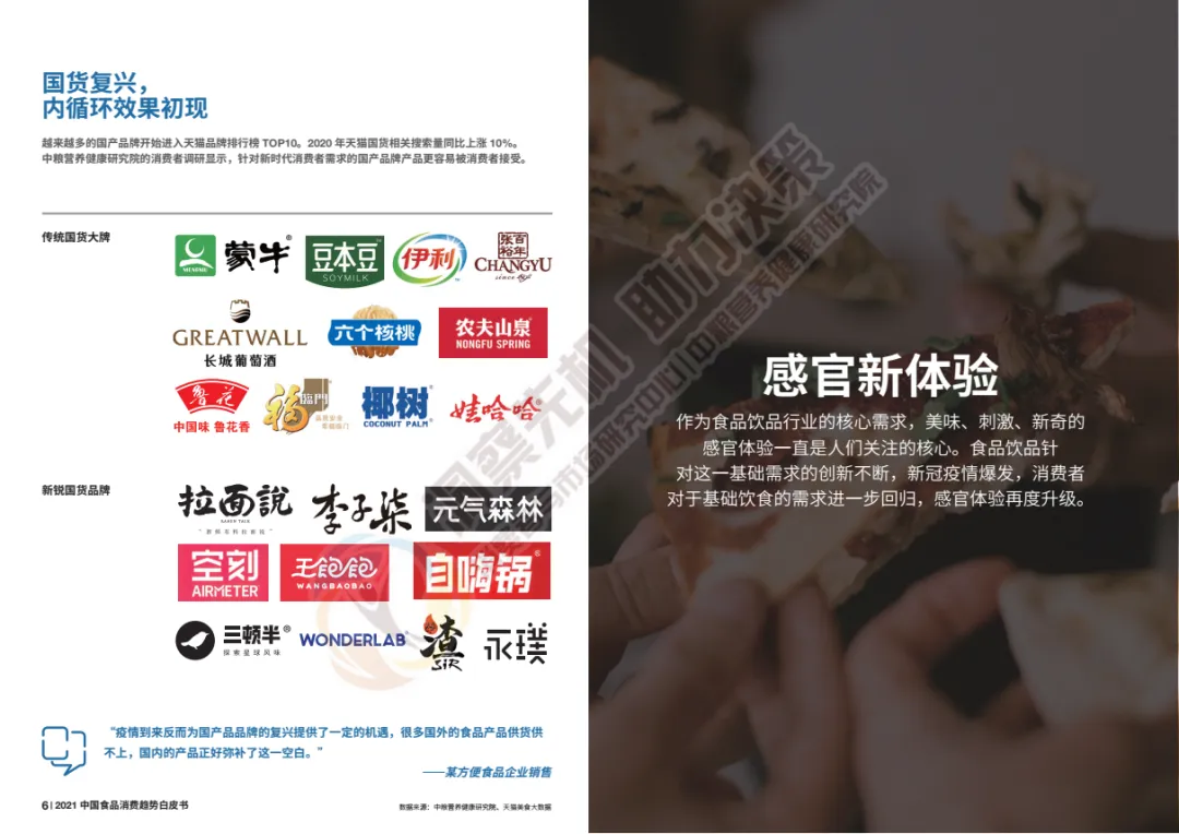 在此背景下,中轻投资、全国糖酒商品交易会、中粮营养健康研究院与天猫美食,于2021年4月8日联合发布了《2021中国食品消费趋势白皮书》。白皮书覆盖食品各个细分品类,透过分析研究消费者对食品的核心需求及各需求在不同阶段的表现特点,总结提炼了五大方面的食品消费趋势——感官新体验、健康新平衡、便捷新形式、情感新连接、文化新自信,旨在为相关食品企业提供指导方向,帮助企业更好地迎接后疫情时代的新挑战,推动食品行业健康发展。