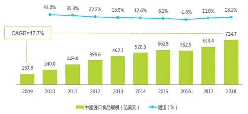 2009-2018年十年间,进口食品规模以17.7%的复合增长率高速增长,2018年首次超过700亿美元。得益于中国经济的快速发展,国民生活水平的不断提升,开放政策的支持以及贸易便利化措施的不断完善,进口食品已经逐渐成为寻常百姓餐桌的重要组成部分。