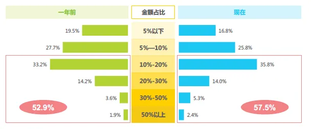 随着消费观念的转变和生活品质的提升,进口食品不再是奢侈的象征,而是已经逐渐融入居民的日常生活当中被越来越多的消费者所接受。当前,57.5%的消费者在进口食品上的消费金额占整体食品消费的比例超过了10%,这一比例比一年前增长了近5%。