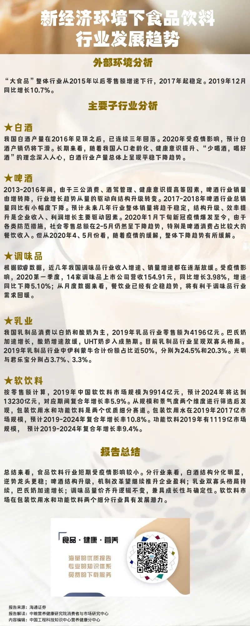 【编者的话】时至今日,我们与新冠肺炎“共处”已长达半年之久。疫情之下,消费者的消费方式发生了翻天覆地的变化,如大多消费者逐渐形成了线上下单的消费习惯,并对食品的方便和营养等方面提出了更高的要求。销售方式逐渐由线下转变为线上,线下商家受到巨大冲击。与此同时,疫情强化了食品行业的马太效应,形成龙头商家强者更强的格局。例如餐饮业市场规模以每年9%的增速扩大,但供给端已经进入存量竞争,行业格局正向连锁化加强的趋势迈进。中国农业大学食品科学与营养工程学院罗云波教授指出,“总体来讲,疫情会加剧食品行业的内部分化,拥有充足现金流,能够撑一年两年的、有实力的企业,在复工速度、稳定市场和吸引人才方面肯定是有优势的。”短期来看,疫情对食品饮料上半年的消费造成严重的冲击,但食品饮料作为刚性需求,在疫情得到控制后,行业的消费会逐渐恢复。不过,在这次疫情中,电商、物流、5G等领域IT技术优势强势凸显,不仅催生了消费者们新的消费习惯,也逐渐倒逼传统企业加速转型。未来食品企业需要对新技术以及市场需求更加敏感才能有光明的前景。那么食品饮料行业的主要子行业在新经济环境下的发展现状与趋势如何呢?让我们一起来看看海通证券发布的《新经济环境下食品饮料行业发展趋势》报告吧!