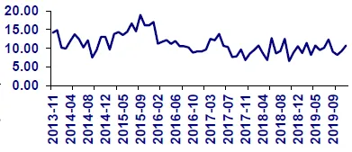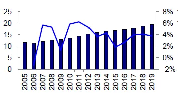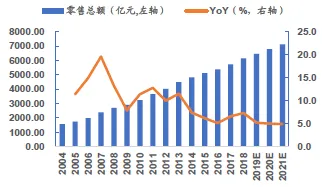 “大食品”整体行业从2015年以后零售额增速下行,2017年起企稳。2019年12月同比增长10.7%。
