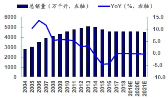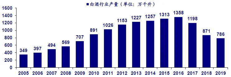 我国白酒产量在2016年见顶之后,已连续三年回落,2019年较2016年回落42.12%。2020年受疫情影响,预计白酒产销仍将下滑。长期来看,随着我国人口老龄化、健康意识提升、“少喝酒,喝好酒”的理念深入人心,白酒行业产量总体上呈现平稳下降趋势。
