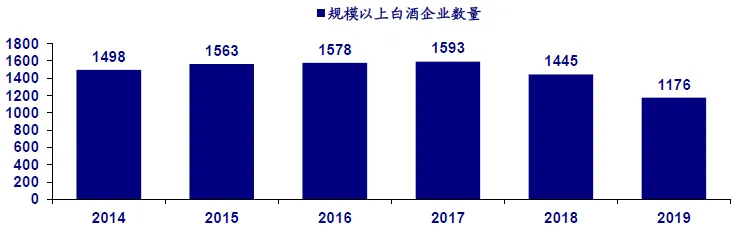 纳入国家统计局统计的规模以上白酒企业数量2017年达到近年峰值1593家,随后也出现连续回落,2019年较2017年减少417家,下降26.18%。在白酒产量持续下降的大背景下,企业数量的下降也将成为长期趋势。