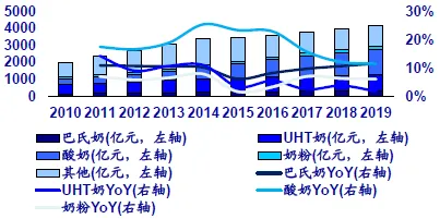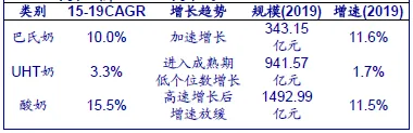 我国乳制品消费以白奶和酸奶为主,2019年乳品行业零售额为4196亿元。巴氏奶加速增长,酸奶增速放缓,UHT奶步入成熟期。