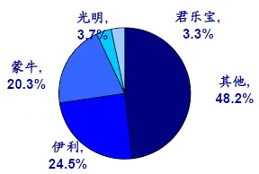 目前乳制品行业呈现双寡头格局。2019年乳制品行业中伊利蒙牛合计份额占比近50%,分别为24.5%和20.3%。光明与君乐宝分别占3.7%、3.3%。
