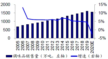 根据欧睿数据,近几年我国调味品行业收入增速、销量增速都在逐渐放缓,2019年调味品行业零售额为1281.52亿元,同比增长7.87%,行业销量为1601.9万吨,同比增长4.60%。