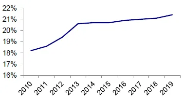 目前调味品的行业集中度仍较低。零售端CR5从2010年的18.20%提升至2019年的21.40%。在消费升级、环保趋严等趋势下,盈利微薄的中小厂商将逐渐被淘汰,行业集中度有望持续提升。