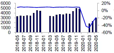 2020年1月下旬新冠疫情爆发至今,由于各类防范措施,社会零售总额在2-5月仍然呈下降趋势,特别是啤酒消费占比较大的餐饮收入。但从2020年4、5月份看,随着疫情的缓解,整体下降趋势有所缓解。