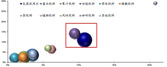 按零售额计算,2019年中国软饮料市场规模为9914亿元,预计2024年将达到13230亿元,对应期间复合年增长率5.9%。从规模和景气度两个维度进行筛选后发现,包装饮用水和功能饮料是两个优质细分赛道。包装饮用水在2019年有2017亿市场规模,预计2019-2024年复合年增长率10.8%。功能饮料2019年有1119亿市场规模, 预计2019-2024年复合年增长率9.4%。