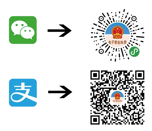 第一步,法定代表人通过微信或支付宝扫描以下二维码打开电子营业执照小程序,按照提示下载电子营业执照。