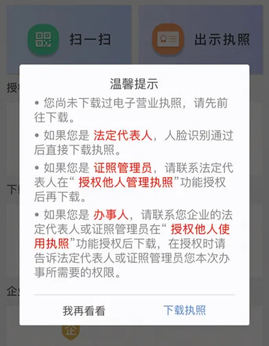 授权完成后,授权经办人需按照“1.电子营业执照下载”的提示,下载电子营业执照。