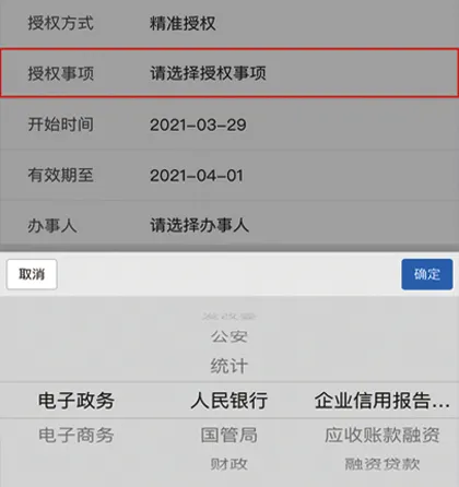第五步,选择授权方式为“全业务授权”或“精准授权。若为“精准授权”,选择授权事项为“电子政务-人民银行-企业信用报告查询”。授权期限默认为3天,可自行调整。