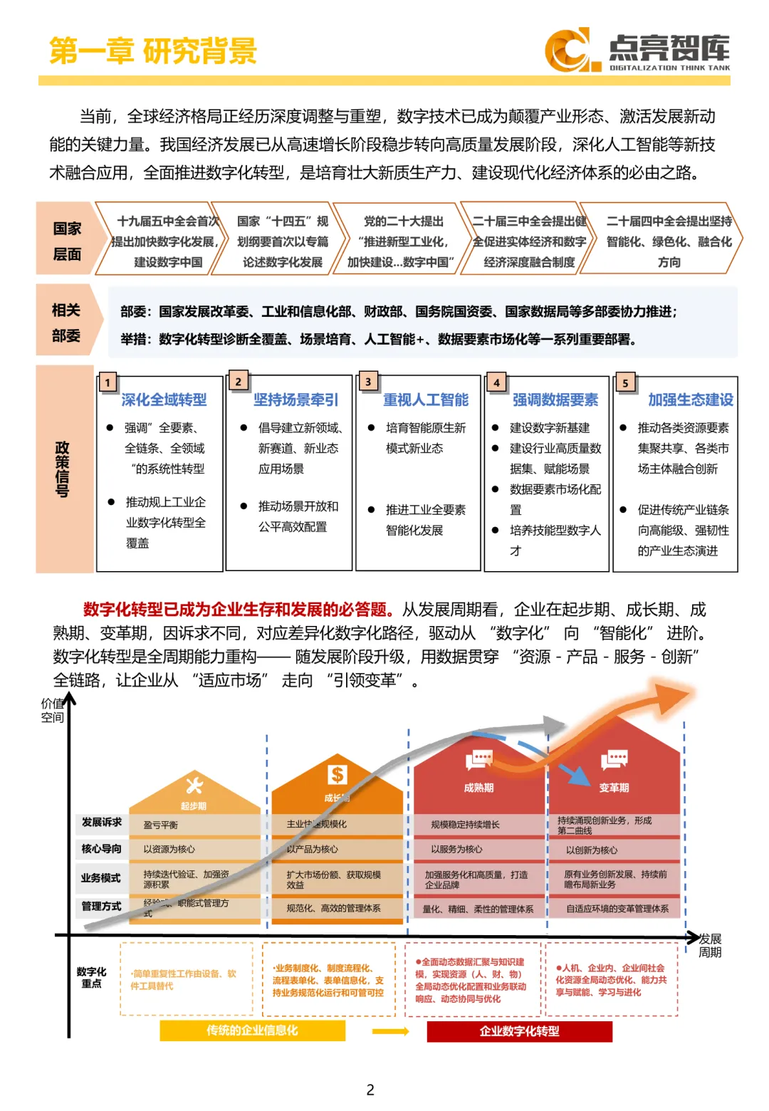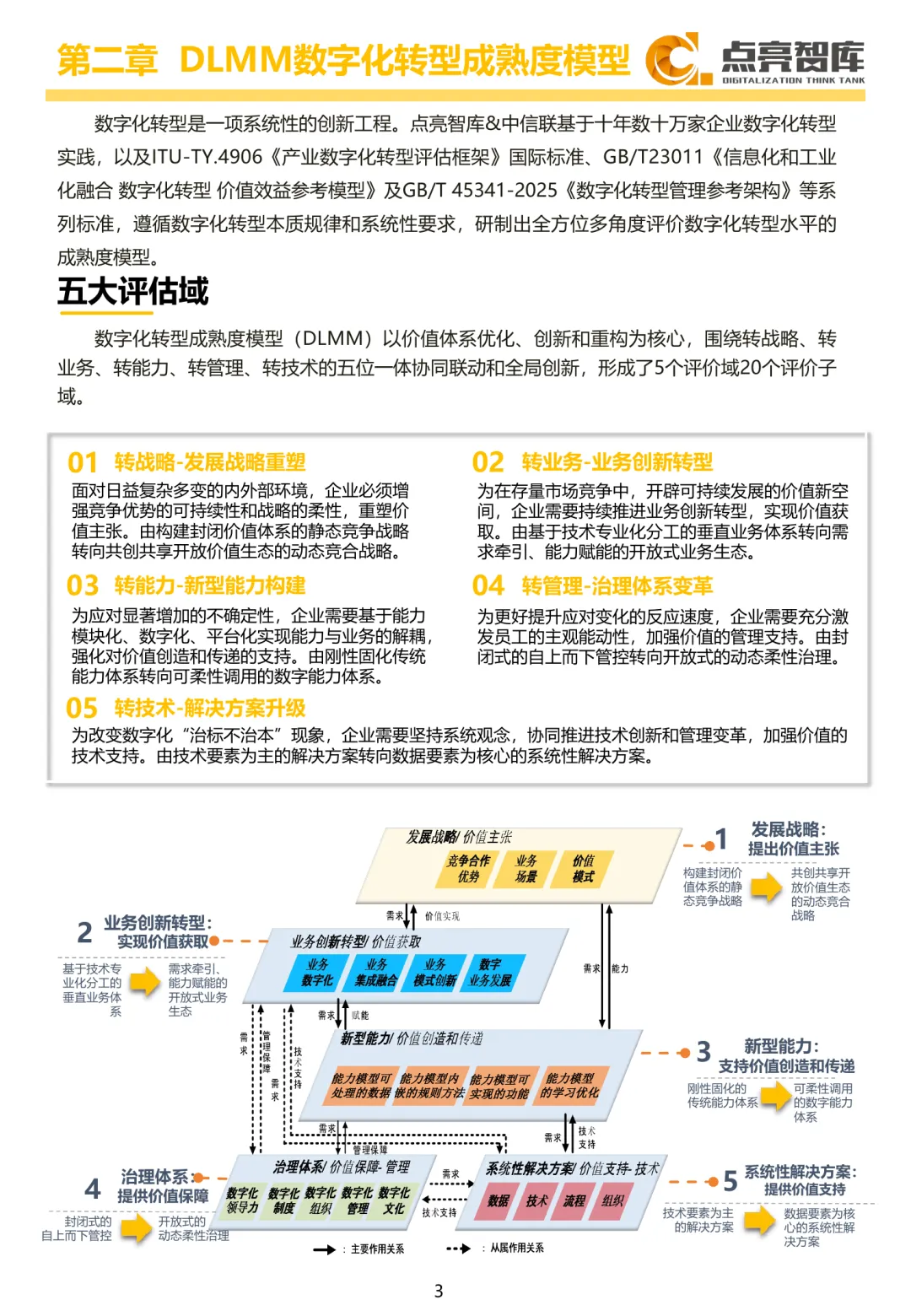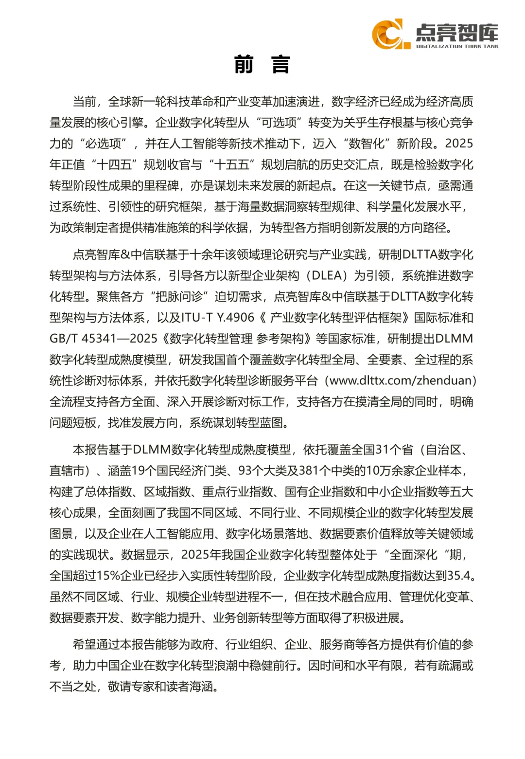2025年,企业数字化转型进入全面深化阶段。随着新一轮科技革命和产业变革加速推进,数字经济成为推动经济高质量发展的核心动力。企业数字化转型已从“可选项”转变为关乎生存与竞争力的“必选项”,在人工智能等新技术驱动下,迈入“数智化”新阶段。报告基于DLMM数字化转型成熟度模型,结合全国31个省(自治区、直辖市)、涵盖19个国民经济门类、93个大类及381个中类的10万余家企业样本,构建了总体指数、区域指数、重点行业指数、国有企业指数和中小企业指数五大核心成果,系统呈现我国企业数字化转型的发展现状与趋势。2025年我国企业数字化转型整体处于“全面深化”期,超过15%的企业已进入实质性转型阶段。企业在人工智能应用、数字化场景落地、数据要素价值释放等关键领域展现出积极实践态势。通过系统性研究框架,报告旨在揭示数字化转型规律,科学量化发展水平,为政策制定提供依据,为企业转型提供方向指引。报告依托DLTTA数字化转型架构与方法体系,以及ITU-T Y.4906国际标准和GB/T 45341—2025国家标准,构建了覆盖全要素、全过程的诊断对标体系,支持企业全面掌握自身转型状态,识别短板,明确发展方向,系统规划转型路径。