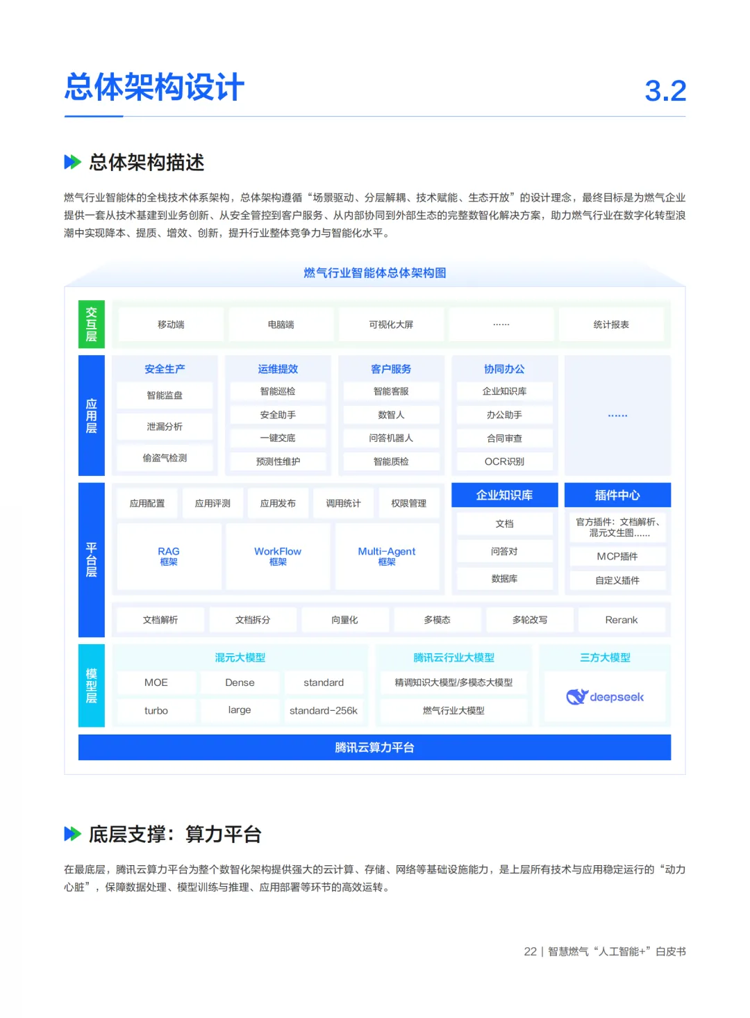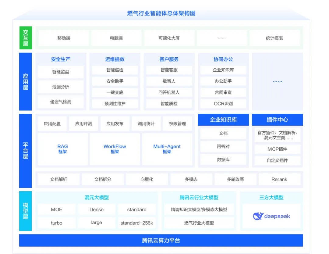 项目围绕“智慧燃气安全生产大模型”建设,规划并实施了六大智能应用场景,覆盖行业知识问答、智能报表生成、沉浸式交互服务、运营管理巡检、营销服务质检及全域安全监盘等关键业务环节。平台总体架构采用分层设计,涵盖算力、模型、平台、应用与交互五大层级,核心技术由腾讯云等提供支撑,包括大模型智能体开发平台、数据与存储、算力部署等,确保在多源数据融合、模型训练推理、工具调用与安全保障等方面具备完整能力。项目实施以来,在安全提升、效率提升、成本优化方面提升显著,为行业探索“人工智能+燃气”提供了清晰、可复制的实践路径。