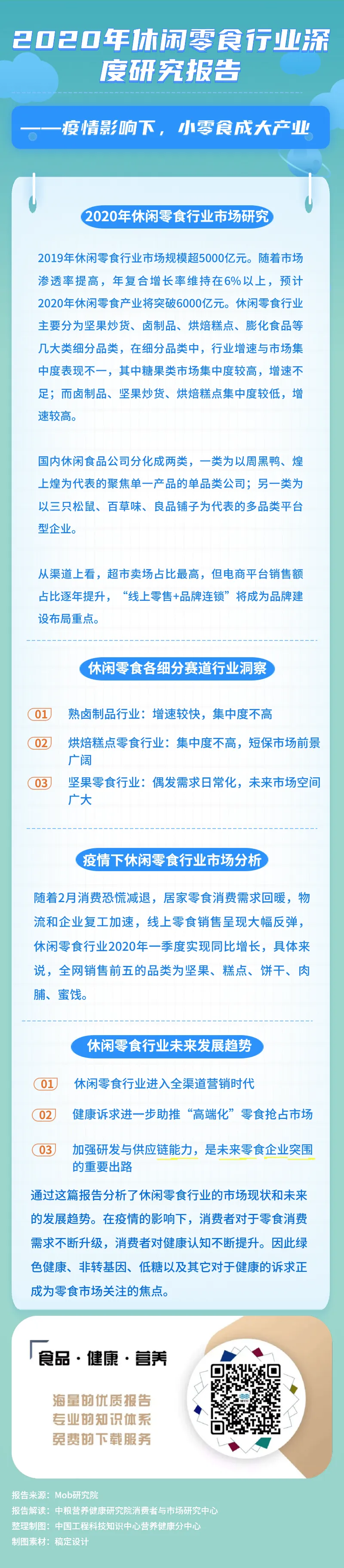 通过这篇报告分析了休闲零食行业的市场现状和未来的发展趋势。在疫情的影响下,消费者对于零食消费需求不断升级,消费者对健康认知不断提升。因此绿色健康、非转基因、低糖以及其它对于健康的诉求正成为零食市场关注的焦点。