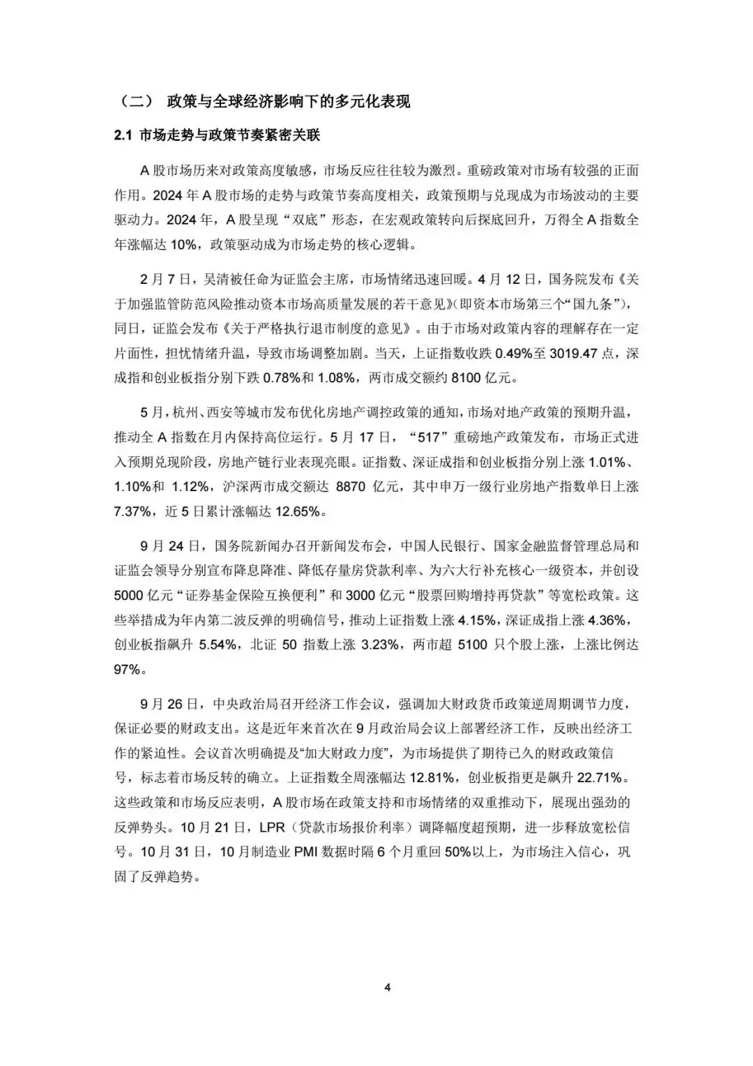 这份报告聚焦宏观政策、市场表现、投资者行为及上市公司运营等核心维度,系统呈现2024-2025年A股市场发展态势。报告显示,宏观层面,经济稳中向好与政策精准发力形成支撑,消费、科技等领域获政策倾斜;市场层面,指数波动显著但估值处于历史低位,行业轮动呈现科技与红利双轮驱动特征;投资者结构持续优化,机构投资者影响力提升,北向资金增配新兴行业;上市公司在盈利、分红与回购等方面表现分化,国企与新兴产业成为市场重要支撑。同时,报告也警示化债政策、量化策略同质化及外部贸易环境等潜在风险,为理解A股市场运行逻辑与投资方向提供了全面参考。