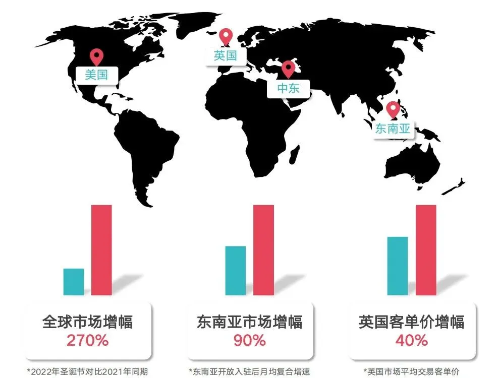 TikTok全球16亿月活用户筑牢流量基础,目前已上线8个站点,东南亚开放入驻后月均复合增速达270%,2023年电商交易额预计达230亿美元。