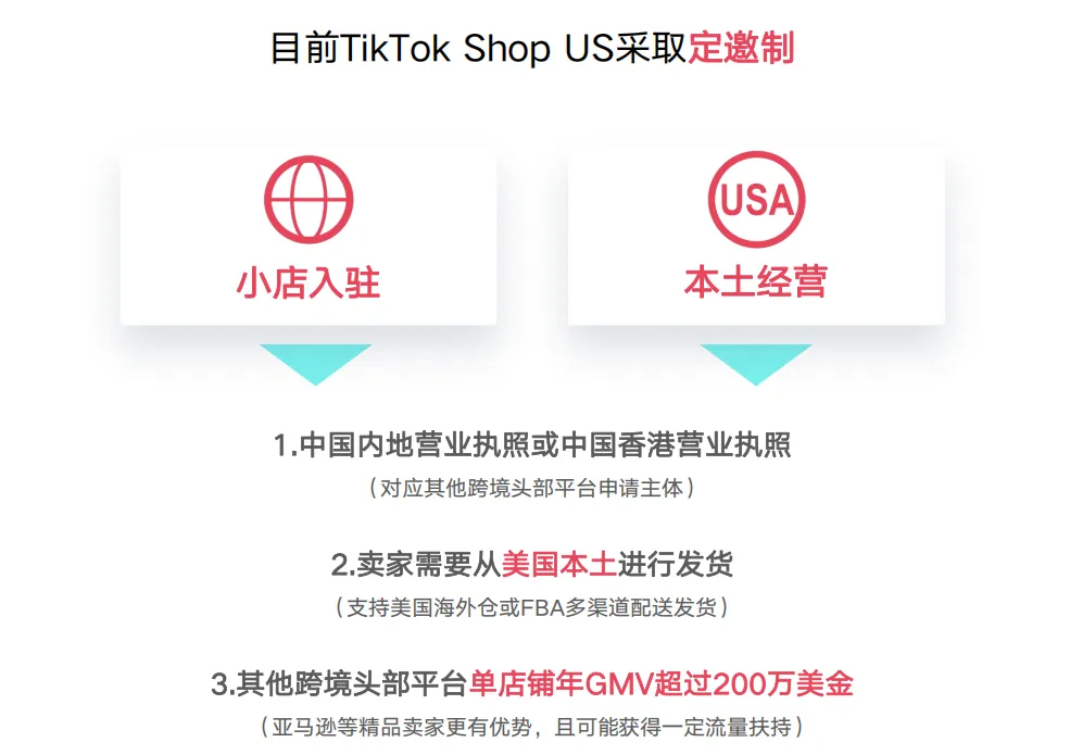 TikTok Shop美区采取定邀制入驻,要求卖家持有正规营业执照、美国本土发货且头部平台年GMV超200万美金,可通过专属通道享入驻对接与流量扶持。