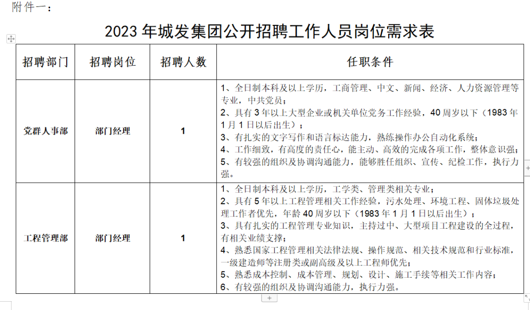 此次计划招聘工作人员2名,详见《2023年城发集团公开招聘工作人员岗位需求表》(附件一)。
