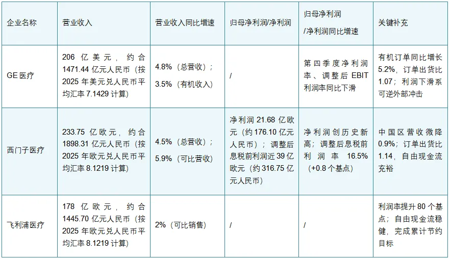 近期,各大医疗设备企业陆续发布2025年业绩财报及相关数据,作为行业核心力量的国际巨头GE医疗、飞利浦医疗、西门子医疗也相继披露了全年经营情况。三家企业凭借扎实的业务根基与全球化布局,实现差异化发展,既有业绩突破,也面临阶段性挑战,行业分化特征显著。