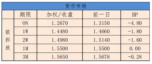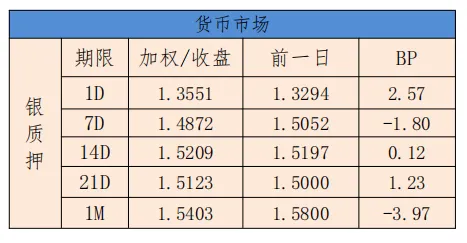 今日银行间市场主要回购利率整体上行。隔夜加权平均利率收盘于1.3551%,上日的收盘价为1.3294%,上行2.57BP;14天收盘价为1.5209%,相比较昨天的收盘价格1.5197%,上行0.12BP。