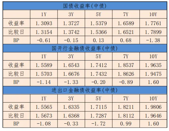 国债5年期带动曲线对应期限上行0.13BP,至1.5379%;7年期带动曲线对应期限下行0.68BP,至1.6589%。