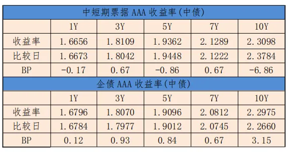 中债中短期票据收益率曲线(AAA)1年期收益率下行0.17BP,至1.6796%,3年期收益率上行0.67BP,至1.8109%。