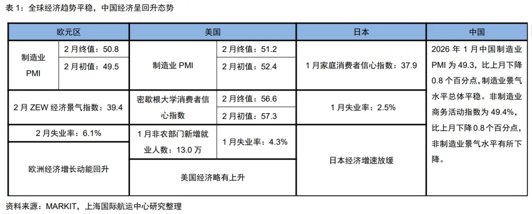 中东局势升级:在美国与以色列对伊朗实施联合打击后,伊朗伊斯兰革命卫队宣布关闭霍尔木兹海峡,全球航运体系面临严重冲击。全球航运遭遇双重危机:霍尔木兹海峡关闭,中东海运走廊全面受扰。多个港口停摆、运营受限,船公司宣布暂停全球发往中东的货物订舱。01 世界主要经济体经济运行情况