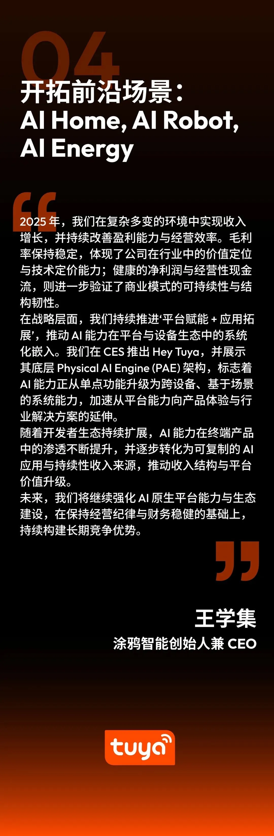 涂鸦智能(纽交所代码:TUYA;港交所代码:2391)是全球领先的AI云平台服务提供商,致力于将AI应用于生活,通过AI Agent开发平台、TuyaOpen开源开发框架等通用AI Agent引擎,集成多模态AI能力,降低AI开发门槛,高效推进AI生活实现,加速AI与物理世界的深度融合。涂鸦智能具备云计算及空间智能等能力,为智能设备、商业应用和行业开发者提供了全新物理AI技术解决方案,以及开放中立的全球化生态,激发了一个由品牌、原始设备制造商、AI Agents、系统集成商和独立软件供应商组成的充满活力的全球开发者社区,共同打造绿色低碳、安全、高效、敏捷和开放的智慧解决方案生态。