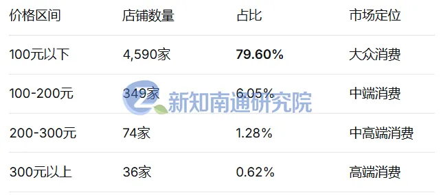 大众消费是绝对主流:近80%的店铺定价在100元以下,说明南通餐饮市场以高频次、低客单的快消模式为主