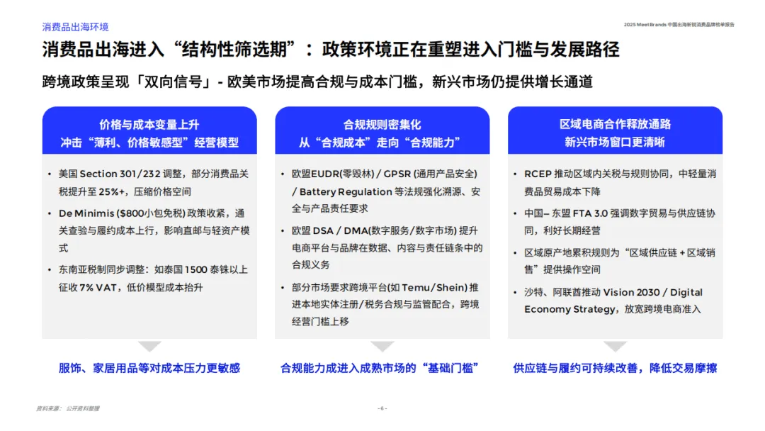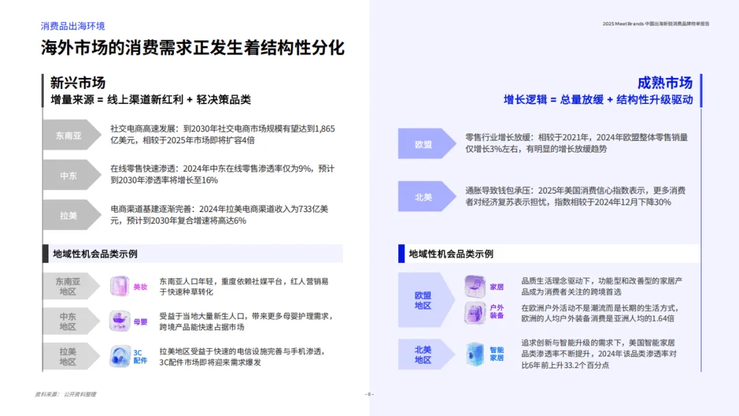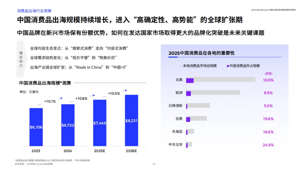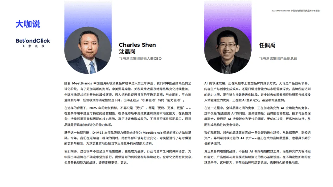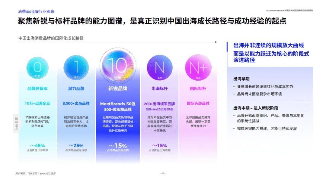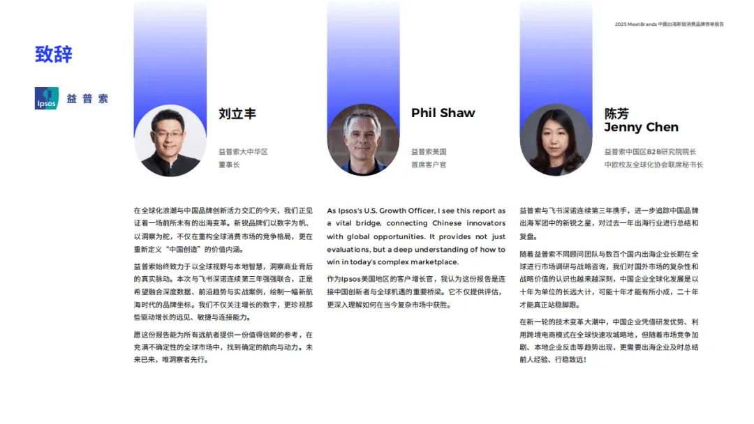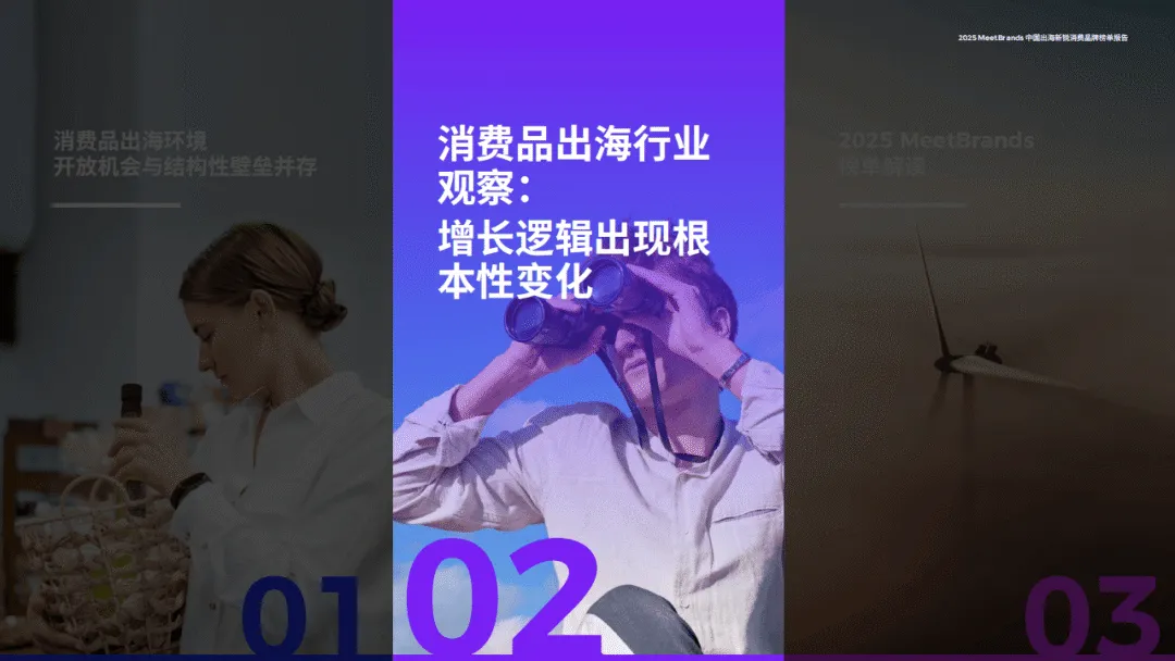 2025MeetBrands中国出海新锐消费品牌榜单报告由飞书深诺与益普索联合发布,结合D-MES出海品牌能力模型的升级迭代,剖析了当下消费品出海的环境特征、行业逻辑变革,并解读了新锐品牌榜单的核心特征,指出中国品牌出海正从“机会驱动”转向“能力驱动”,增长目标聚焦“更稳、更准、更强”。