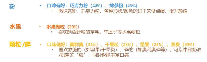 配料的不仅可以添加到茶体中,还提添加到茶顶上,使茶饮造型更多变,外形更具层次感。顶部配料主要包含粉类(巧克力粉、抹茶粉)、水果类(草莓、车厘子)、干果粒/饼干碎。